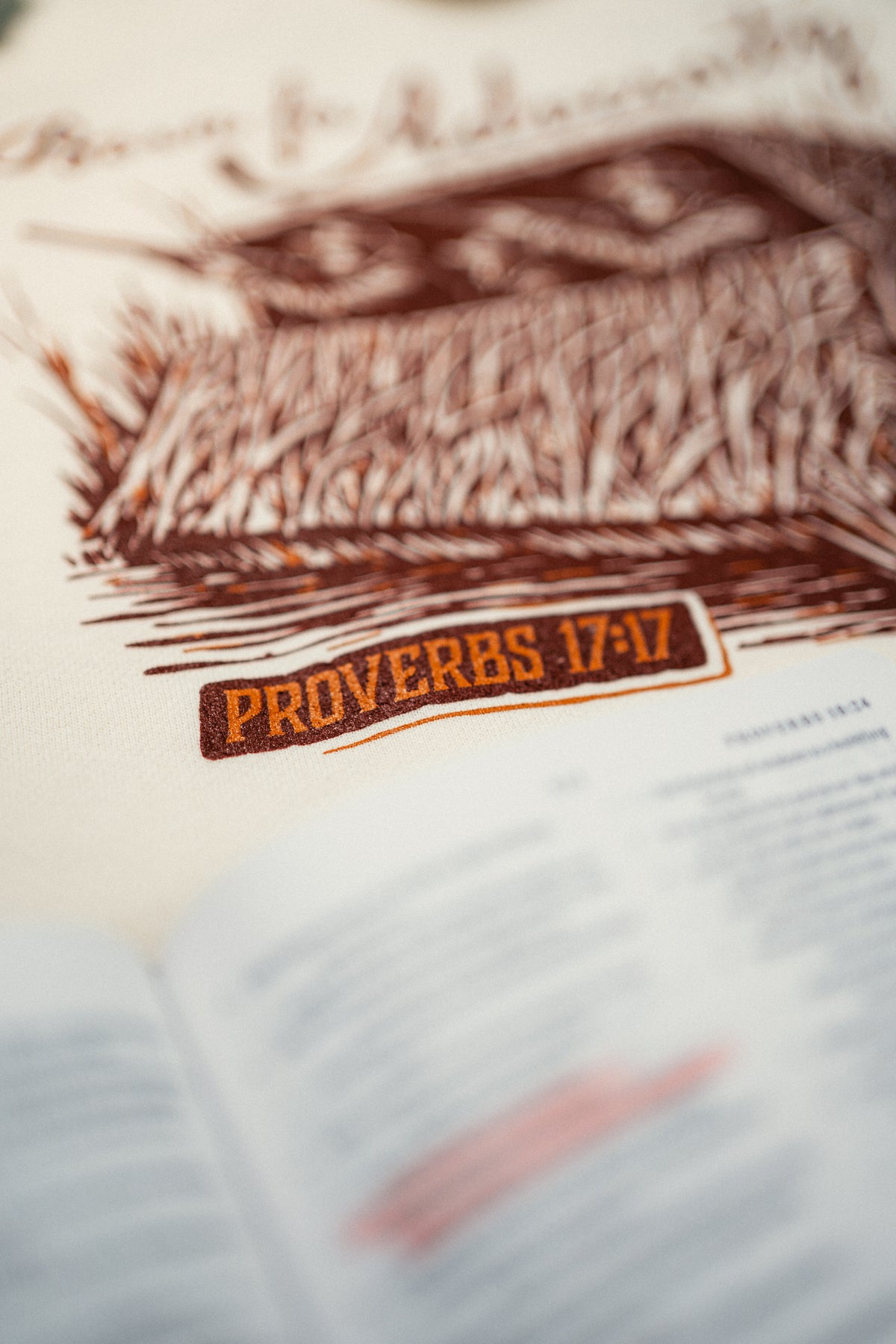 Across the back, a bold screen print captures three hunters in the blind—guns raised, loyal dog at their side—with “Born for Adversity” arched above. Beneath it, Proverbs 17:17 reminds us that “a brother is born for adversity,” a call to stand firm in faith and brotherhood no matter the conditions.